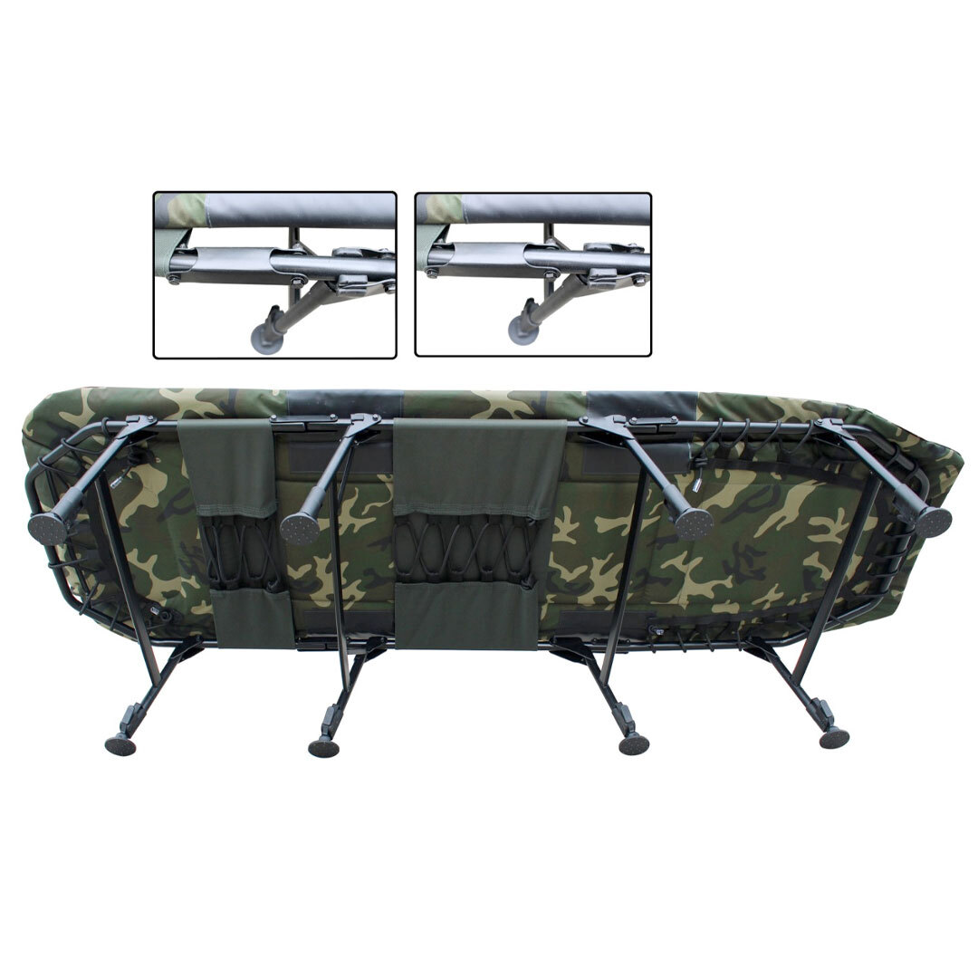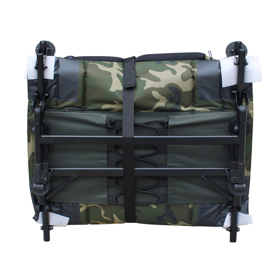 Altı adet tam ayarlanabilir bacak, her türlü arazi koşulunda güvenli bir duruş sağlayan döner çamurluk ayakları (swivel mudfeet) ile donatılmıştır. Baş ve ayak kısmında bulunan yay mekanizmalı tekli bacaklar, hızlı kurulum ve ekstra stabilite sunar. Çift katlanabilir menteşe yapısı sayesinde, yatağı toplarken uyku tulumunu çıkarmanıza gerek kalmadan kolayca paketlenebilir; bu da hem zaman kazandırır hem de taşıma sürecini pratik hale getirir.